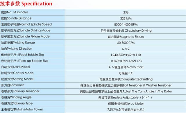 JX318是本公司在吸收国外先进技术, 自行设计的高产节能型倍捻机。有占地少、锭数多、效率高、价格便宜的优点。比较适合加工各种腈、涤丝、混纱、化纤、长丝等纱线。